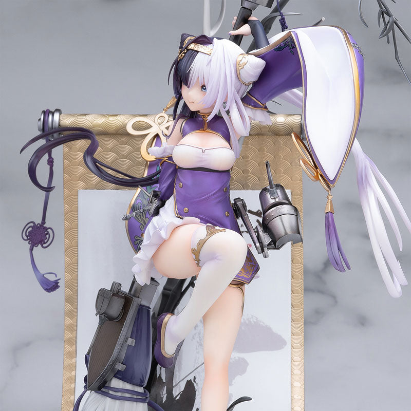 This exquisite figure of Ying Swei from *Azur Lane* by Neonmax is a stunning representation of the character's elegance and power. Ying Swei is depicted mid-leap, her flowing purple and white robes billowing dramatically around her. The intricate details on her outfit, including delicate floral patterns and golden accents, are beautifully rendered, showcasing the craftsmanship behind this piece. The dynamic pose is complemented by the elaborate base, which features a large, unrolling scroll adorned with bamboo illustrations and sculpted ink effects that give a sense of movement and artistry. Her confident expression and the brush she wields add a touch of fierceness, making this figure a captivating addition to any collection.