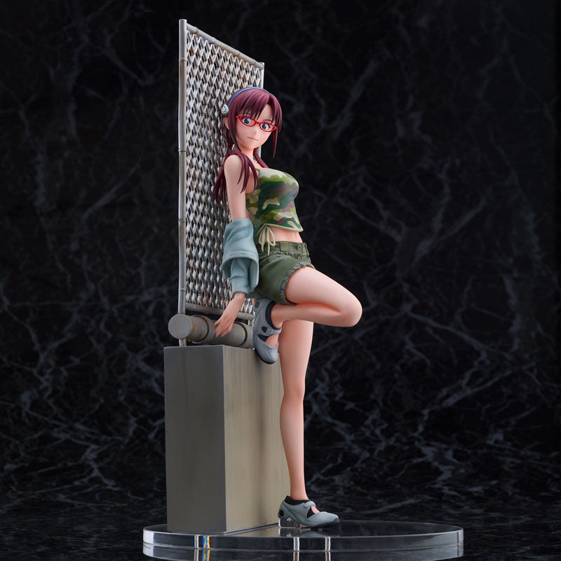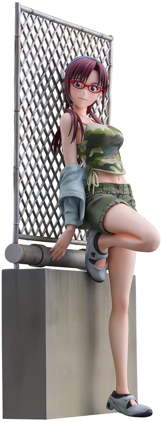 This striking figure of Makinami Mari Illustrious from Evangelion Shin Gekijouban by Union Creative captures her in a casual yet confident pose. Mari is leaning effortlessly against a chain-link fence, embodying her laid-back and cool demeanor. Dressed in a camo crop top and matching shorts, she exudes a blend of toughness and style. The light jacket draped over her arm and her signature red glasses add to her distinct personality. Her long auburn hair flows naturally, complementing her relaxed stance. The attention to detail, from the texture of her outfit to the realistic base, makes this figure a standout representation of Mari's unique character and charisma. This piece is perfect for fans who appreciate Mari's bold and carefree spirit.