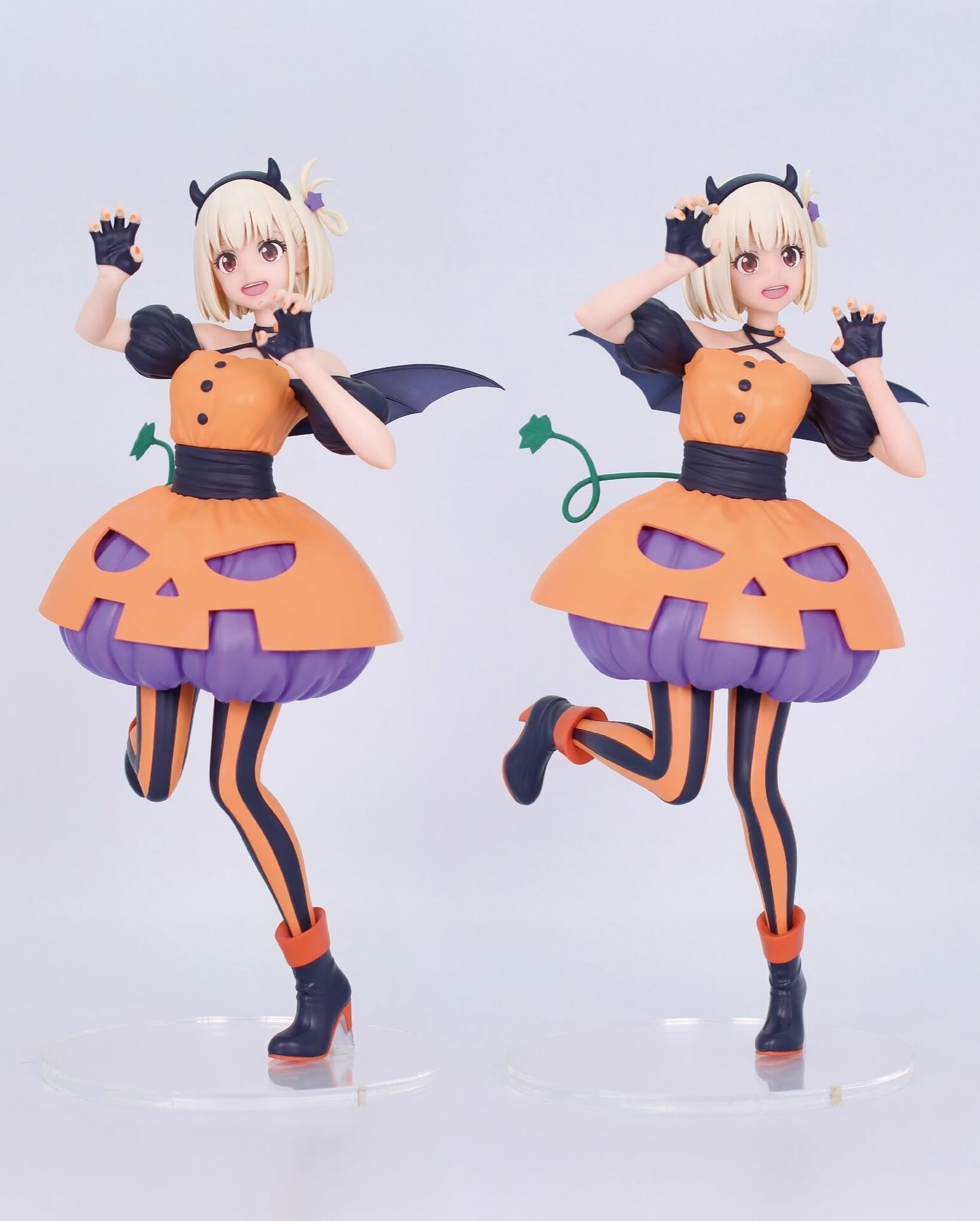 Who could resist the enchanting charm of Halloween? Meet Nishikigi Chisato from "Lycoris Recoil," decked out in a delightful pumpkin-themed ensemble that screams festive fun! This brilliant figure captures her playful spirit with a bewitching orange and purple color palette, complete with a flouncy skirt that’s basically a pumpkin in disguise. Chisato's adorable wings and devilish horns add a mischievous twist, while her sprightly pose radiates joy and spontaneity. A whimsical blend of spook and sweetness, this figure is the perfect addition to your collection, destined to conjure a bewitching vibe in any space!