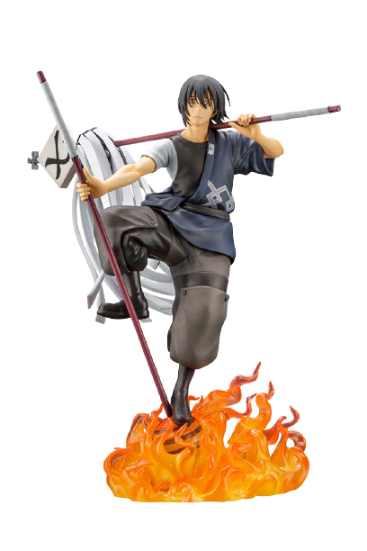 This striking 1/8 scale figure of Shinmon Benimaru from "Enn Enn no Shouboutai" (Fire Force) by Kotobukiya captures the fierce and dynamic nature of the character. Benimaru is depicted in a powerful stance, balancing on one leg with his naginata poised for action. The figure is intricately detailed, showcasing his traditional fire brigade uniform with its distinct blue and gray colors, complemented by his intense expression. The flames at his feet add a dramatic effect, emphasizing his pyrokinetic abilities. His confident pose and the careful craftsmanship make this ARTFX J figure a captivating addition to any "Fire Force" collection, bringing Benimaru's strength and fiery spirit to life.