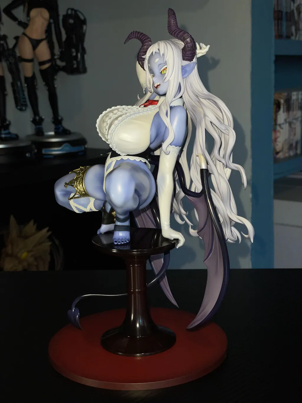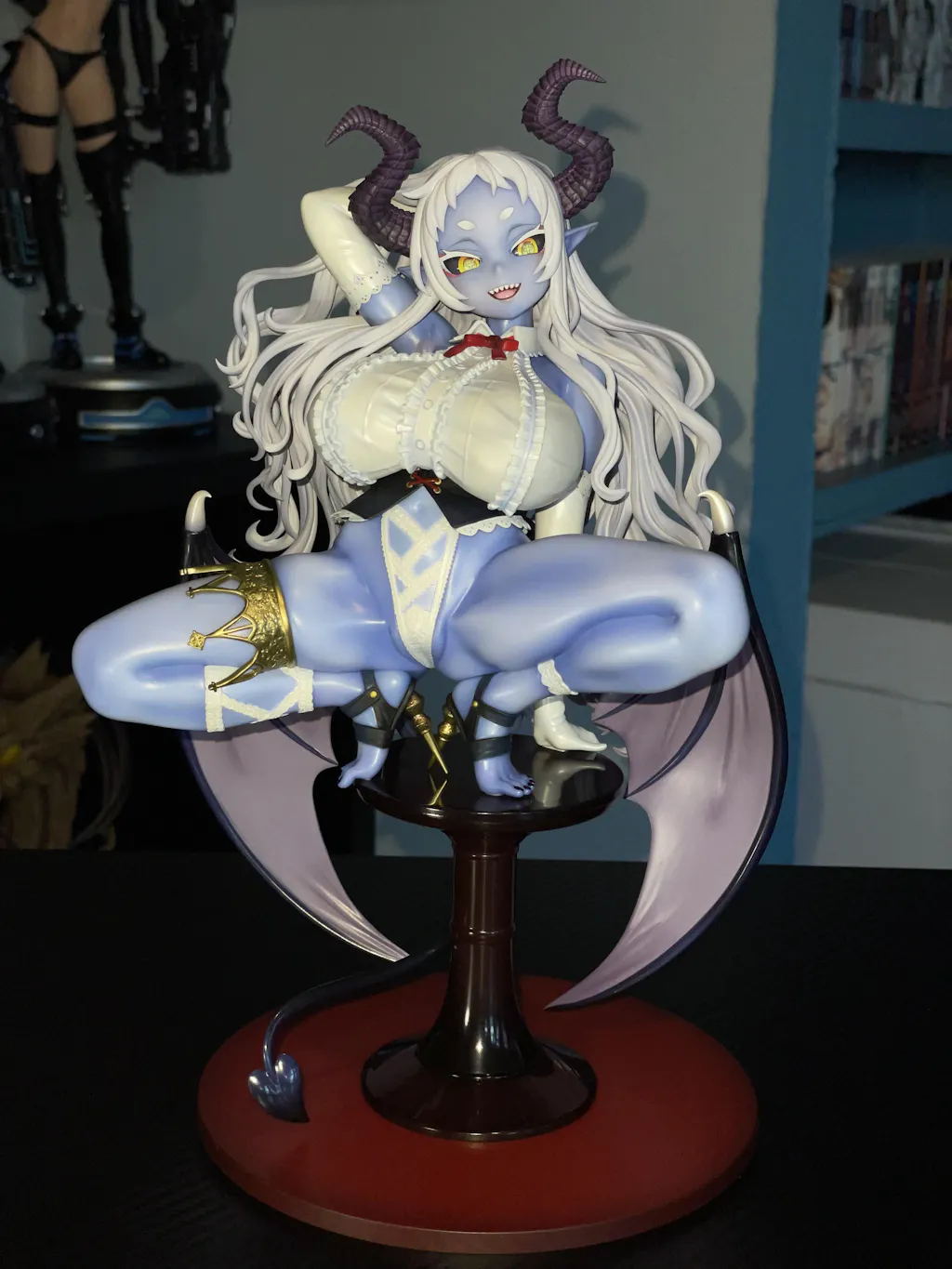 Meet the captivating "Die Erlko König" figure, where mystique and allure intertwine! This figure showcases an enchanting character with beguiling purple hues that echo her otherworldly charm. Her fluffy white hair and stunning detailed features are a feast for the eyes, while her devilish horns add a playful twist. The contrast of her elegant attire, hinted by sultry lace and daring accessories, sets the stage for a truly mesmerizing display. Magnificently perched on a striking base, this figure is the ultimate addition for any realm – be it your bedroom, gaming den, or collector’s shrine! Embrace the enigmatic allure and let this demon queen reign supreme in your collection!
