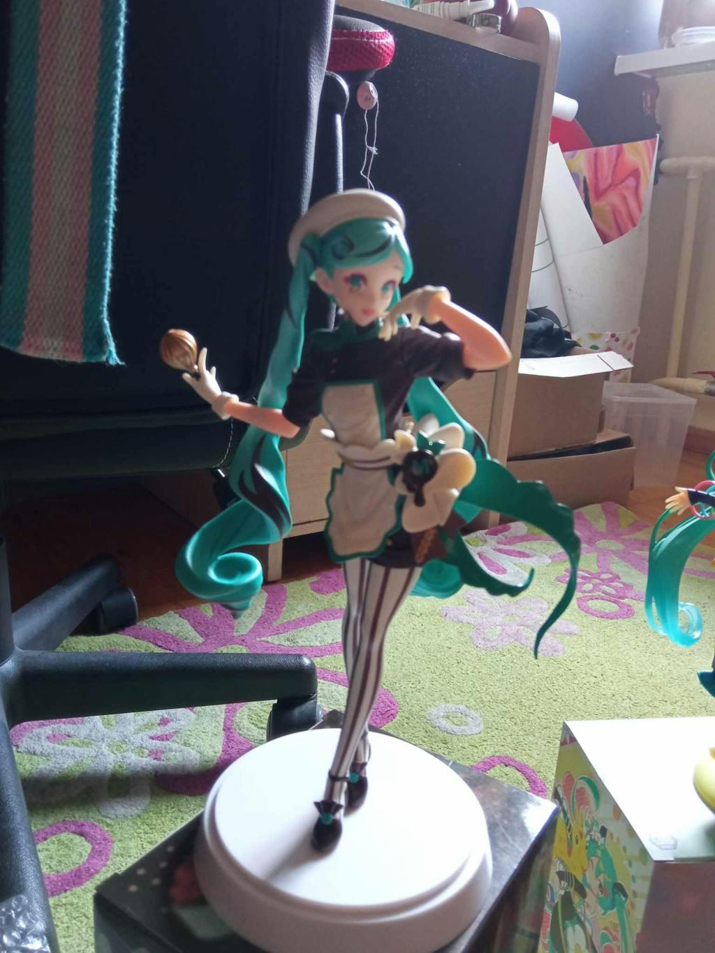 As part of Sega’s beautiful Lunminasta line of prize figures, Hatsune Miku is back in a Bitter Patisserie version. The dessert theme is strong on this figure with every inch and attention to detail able to invoke some sort of dessert feeling. From the Humbug mint inspired tights to the candy brooch on her apron and the cinnamon roll swirls in her hair, this Miku is sure to get you feeling hungry! The cheeky pose and whisk in hand she’s giving off magical girl vibes without being a magical girl. Or maybe she is? A magical girl using her powers to make sweet treats sounds amazing, right?