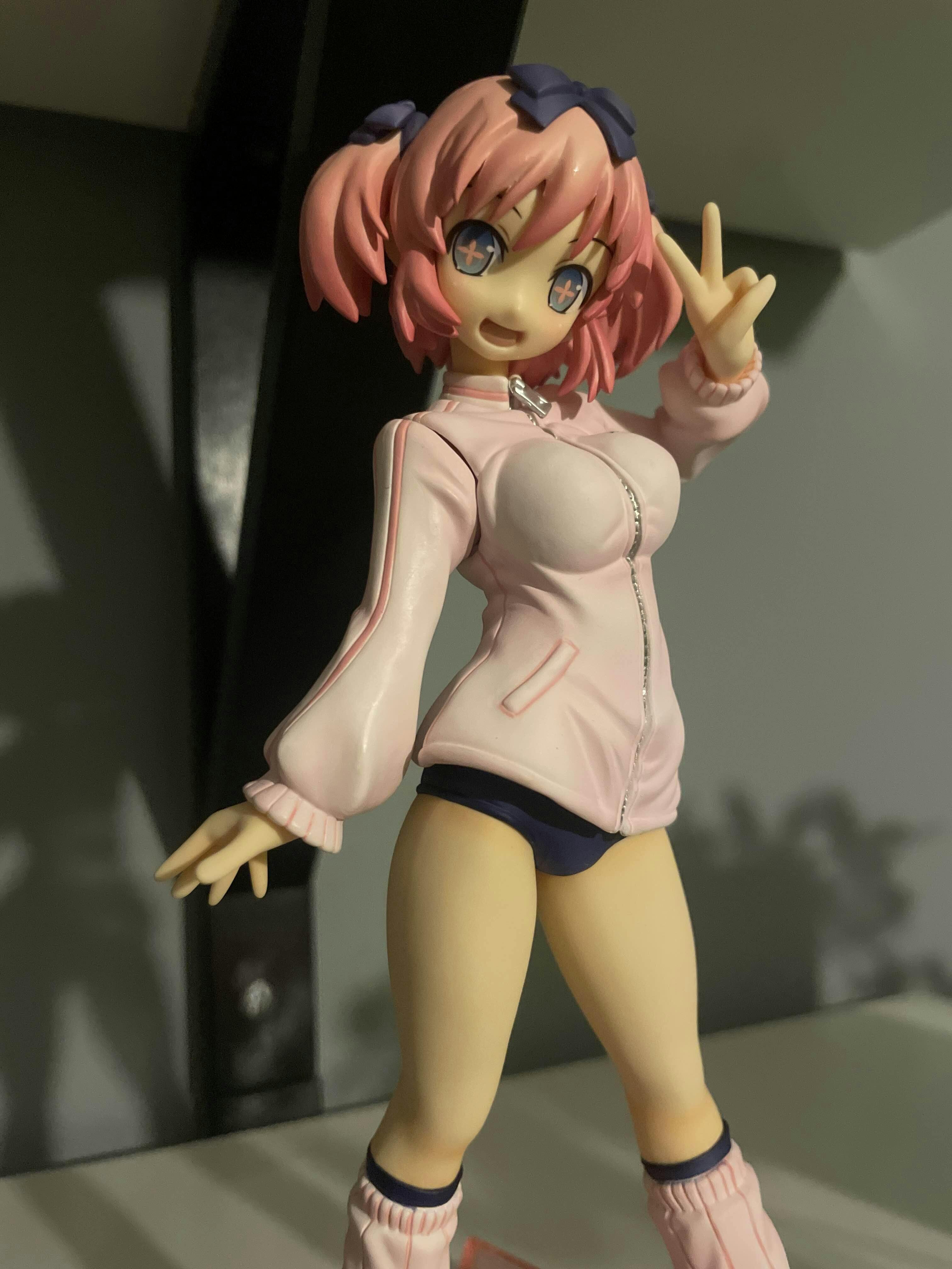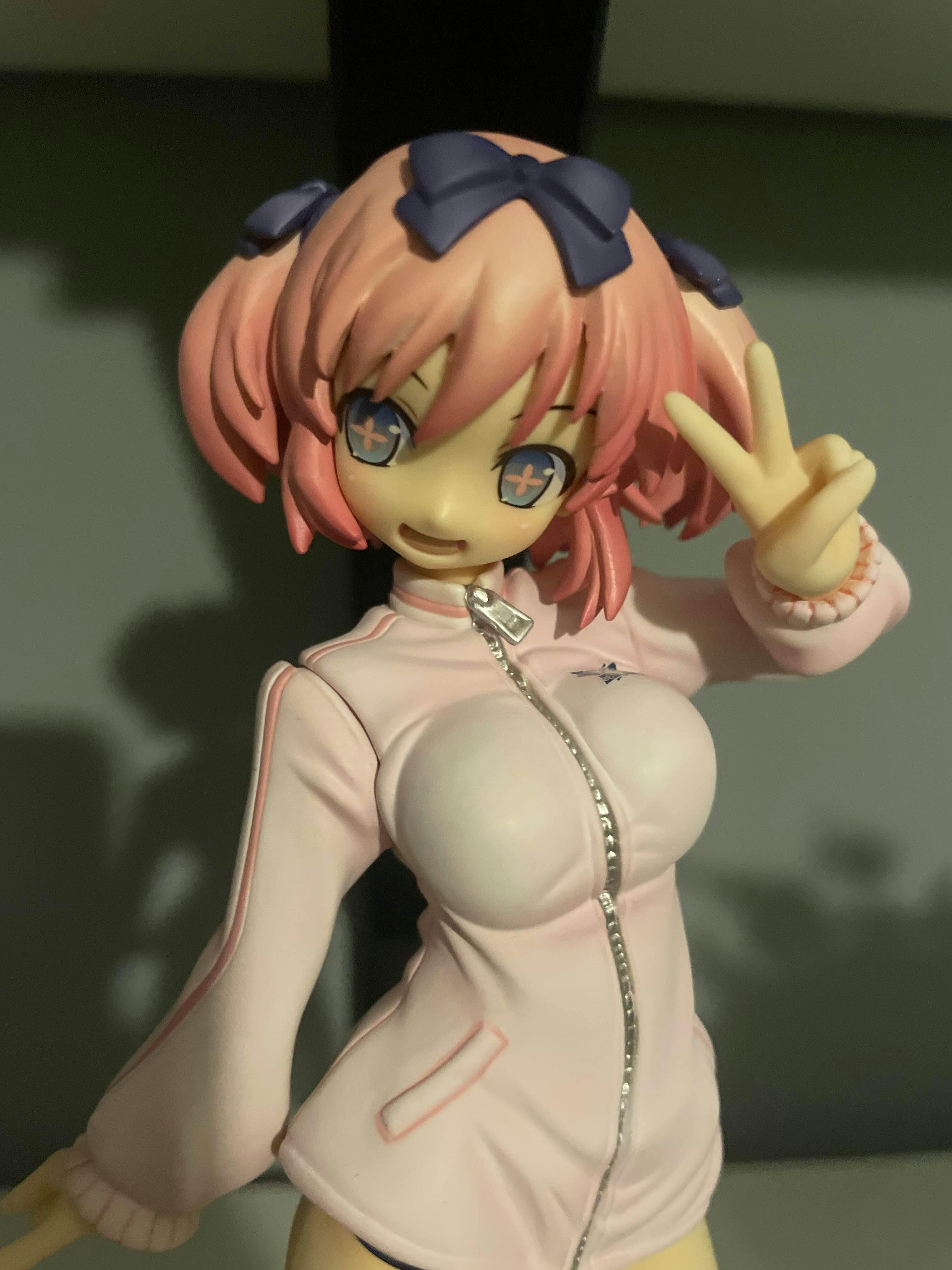 From the popular series Senran Kagura, comes this delightful 1/8 scale figure of Hibari by Phat Company. Hibari is captured in a cute and energetic pose, flashing a cheerful peace sign. Her playful expression and bright eyes bring out her bubbly personality. She’s dressed in a sporty pink tracksuit jacket paired with blue bloomers and matching pink sneakers, giving her a lively and youthful appearance. The figure’s detailed sculpting highlights the folds in her clothing and the texture of her hair, styled in adorable twin tails with blue ribbons. This Hibari figure is a charming addition to any collection, radiating cuteness and energy.