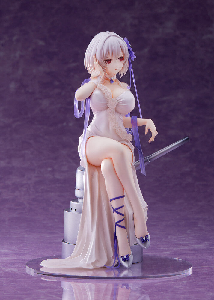 The Azur Lane "Sirius - Dream Tech - White Rose" figure by Wave showcases Sirius in a stunning 1/7 scale. Elegantly seated, Sirius is depicted in a delicate, white gown adorned with intricate floral designs. Her soft, silver hair is styled gracefully, accented with a purple flower, and ribbons that add a touch of charm. The flowing gown drapes beautifully over her form, highlighting her poised and graceful demeanor. Perched atop a ship's artillery piece, this figure combines elements of strength and elegance, capturing Sirius's noble spirit. This masterpiece is perfect for collectors looking to add a touch of refined beauty to their collection.