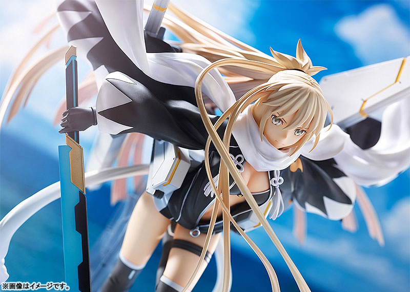 This dynamic 1/7 scale figure of Okita Souji (Assassin) from "Fate/Grand Order" by Good Smile Company showcases the character in her Ascension form. Okita is captured mid-action, her intense gaze and flowing hair adding a sense of motion and energy to the figure. She wields her iconic long sword, detailed with a striking blue edge, ready for battle. Her outfit, featuring a black and white theme with elaborate designs and fluttering ribbons, enhances the dramatic effect. The mechanical wings and detailed base further emphasize her ascended state, giving the figure a powerful and majestic presence. This Okita Souji figure is a must-have for "Fate/Grand Order" fans, perfectly embodying her grace, strength, and determination in a stunning display piece.