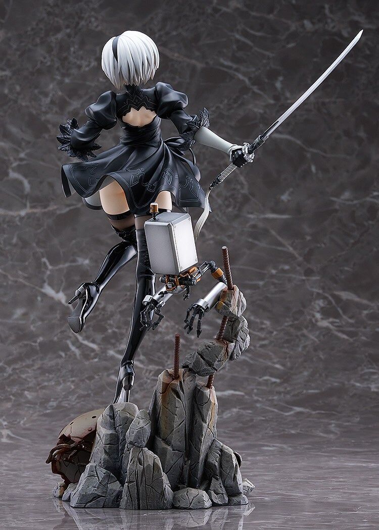 This breathtaking figure of YoRHa No. 2 Type B, or 2B, from "NieR:Automata" by Max Factory perfectly captures the elegance and combat readiness of this iconic character. Sculpted at a 1/7 scale, 2B is depicted in a dynamic pose, mid-air with her katana drawn, showcasing her agility and strength. Her black dress, thigh-high boots, and blindfold are meticulously detailed, adding depth and realism to her portrayal. The base features a beautifully crafted ruined terrain with the Pod 042 by her side, further immersing the figure in the world of "NieR:Automata." The broken machine parts scattered at her feet add a dramatic touch, making this figure a must-have for fans of the game, embodying the haunting beauty and action-packed essence of 2B's character.
