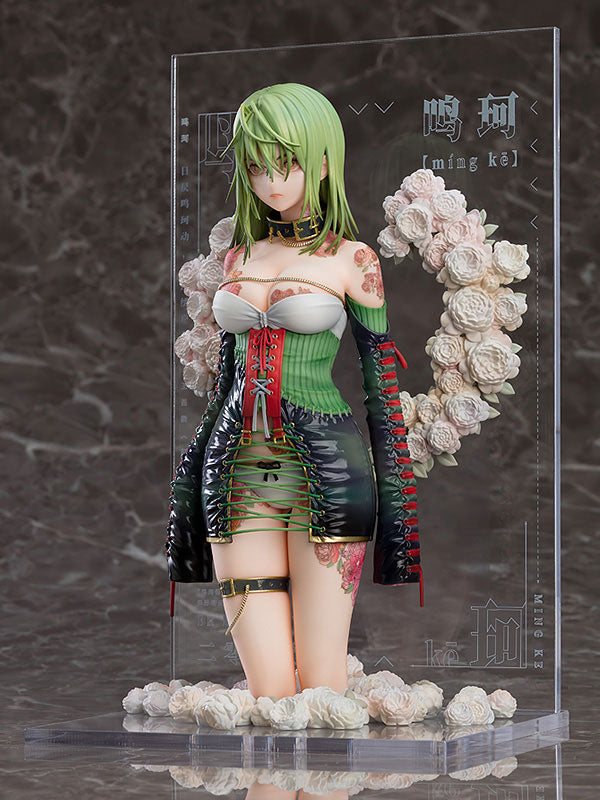 Discover the captivating allure of Yueji Mingke from the Illustration Revelation series by Good Smile Company. This original character figure showcases Yueji in an eye-catching outfit that combines elegance with an edge. Her green hair flows effortlessly, framing her intense gaze. She wears a striking black and green corset dress, intricately laced and adorned with red accents, complemented by matching sleeves. The detailed tattoos and delicate roses surrounding her add to her mesmerizing presence. Standing gracefully among a bed of white roses, this figure exudes both beauty and strength, making it a unique and compelling addition to any collection.