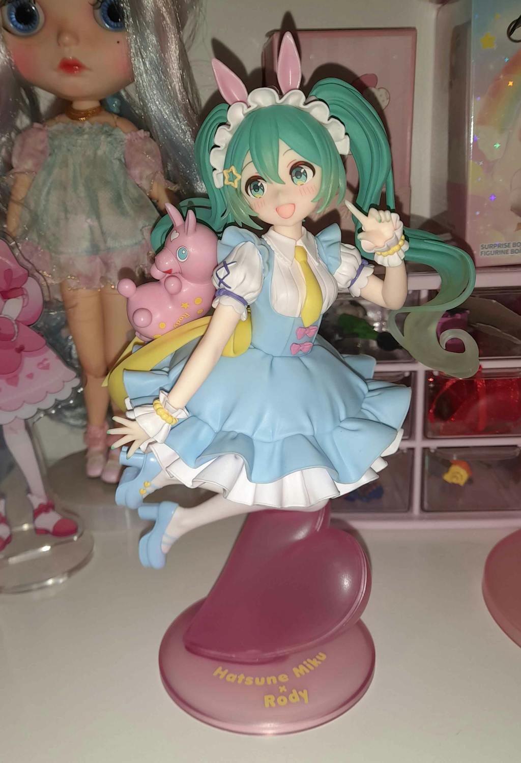 Who wouldn’t want a slice of magical whimsy in their collection? Meet Hatsune Miku in her enchanting Fairy Tale Ver., a delightful fusion of charm and nostalgia! Dressed in an adorable pastel ensemble with a flouncy skirt, she radiates sweetness with her vibrant aqua hair and playful bunny ears. But wait, there’s more! The adorable Rody bounces alongside her, adding an extra dash of cuteness that makes this piece absolutely irresistible. Her lively pose embodies the spirit of joy and fantasy, while the pink heart-shaped base offers a playful touch, perfect for any display. Capturing both animation magic and heartwarming cheer, this figure is a must-have for every Miku fan and collector alike!